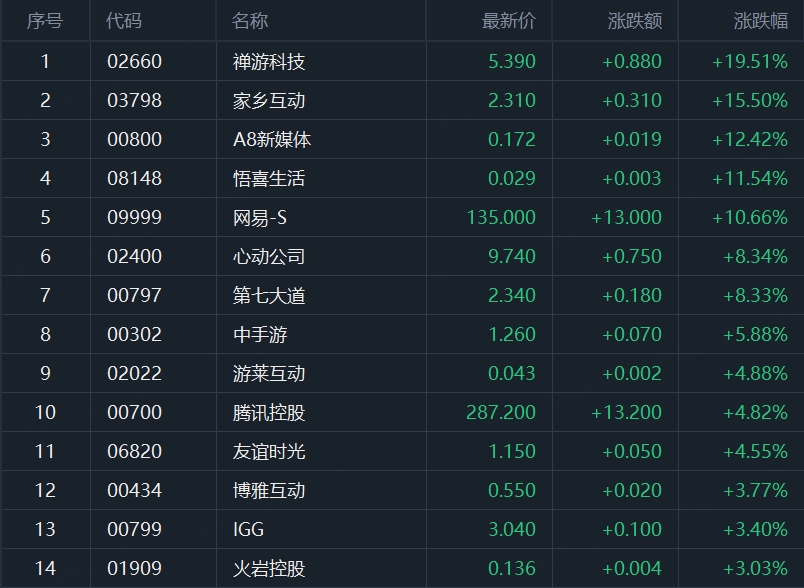 12月27日,港股手游股高开高走,禅游科技涨超19%,网易-S涨超10%,心动公司涨超8%,腾讯控股涨近5%。
