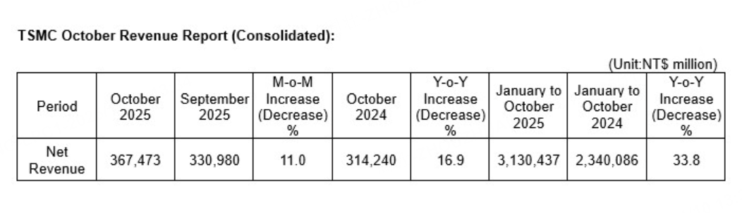 11月10日,台积电今日公布2025年10月销售数据:2025年10月收入约为3674.7亿元新台币,环比增长11%,同比增长16.9%;2025年1月至10月收入总计31304.4亿元新台币,较去年同期增长33.8%。数据发布后,台积电美股夜盘延续涨势,现涨超3%。