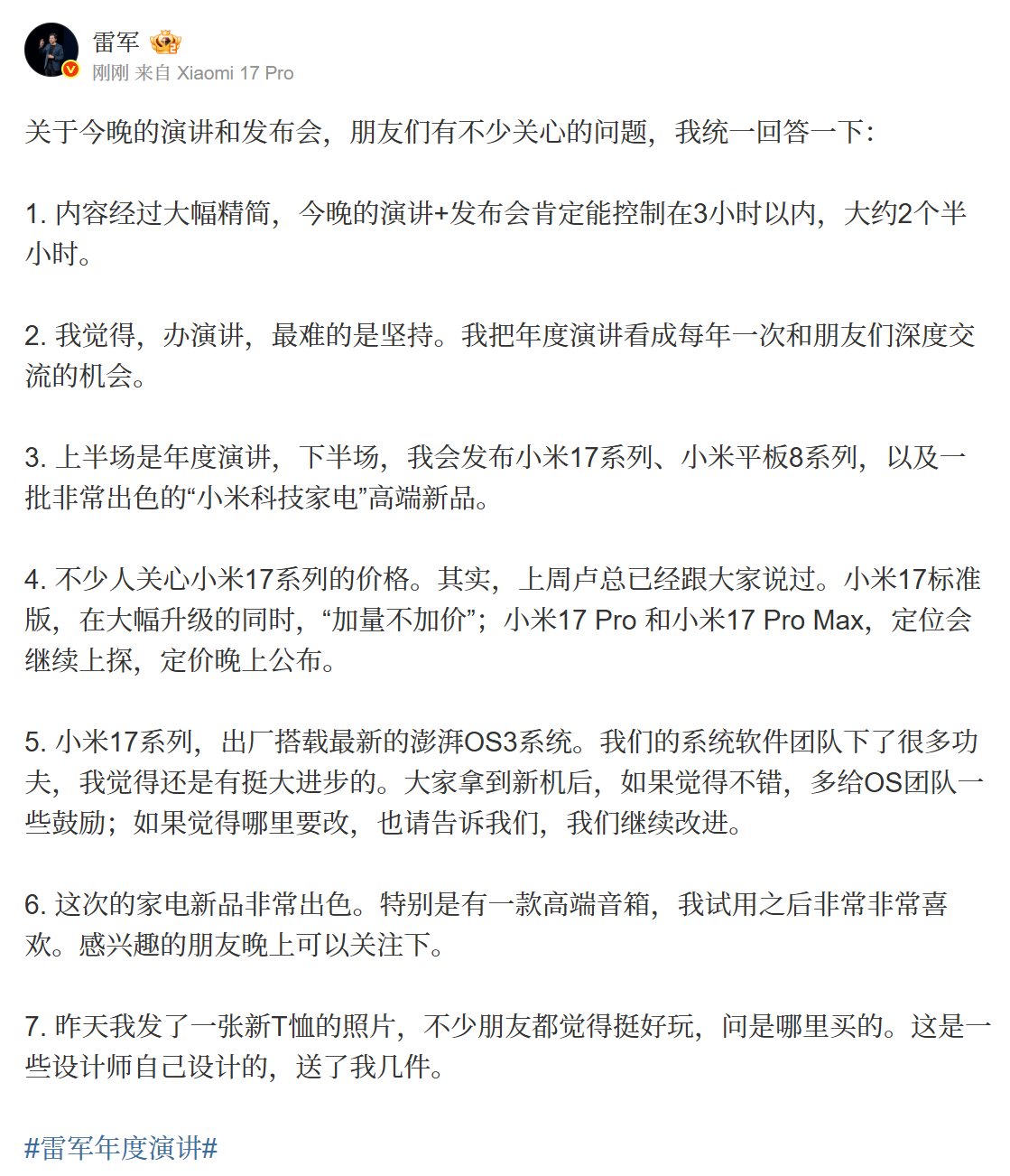 9月25日,小米集团董事长雷军今日在微博发文称,不少人关心小米17系列的价格。其实,上周卢总已经跟大家说过。小米17标准版,在大幅升级的同时,“加量不加价”;小米17Pro和小米17ProMax,定位会继续上探,定价晚上公布。