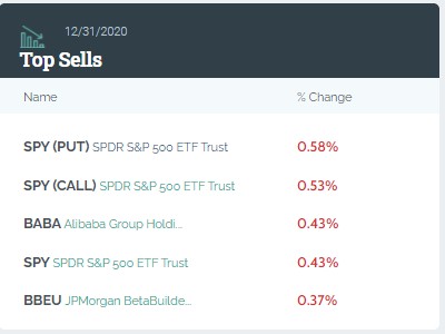 前五大卖出标的分别是:标普500指数ETF看跌期权(SPY.US,PUT)、标普500指数ETF看涨期权(SPY.US,CALL)、阿里巴巴(BABA.US)、标普500指数ETF(SPY.US)、JPMorgan BetaBuilders Europe ETF(BBEU.US)。