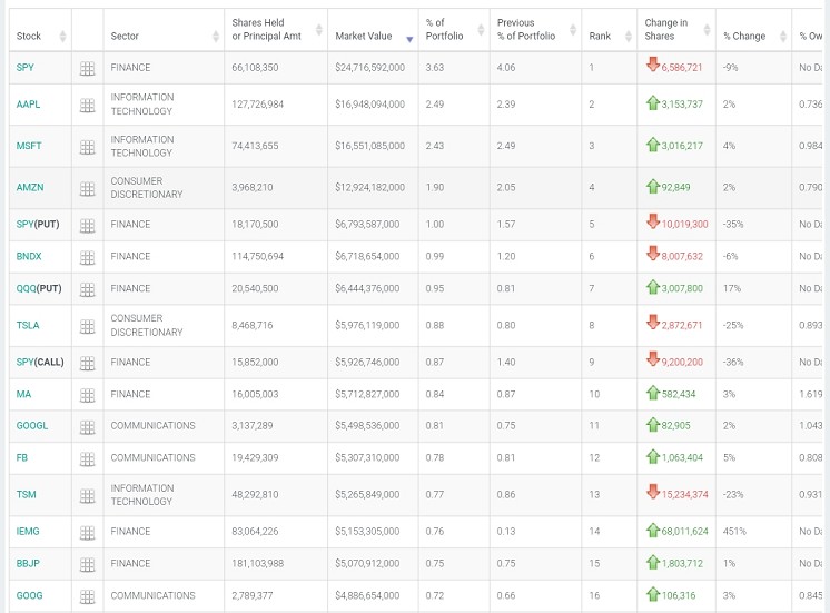 在前五大重仓股中,标普500指数ETF(SPY.US)位列第一,持仓约6610.84万股,持仓市值约247.17亿美元,较上季度持仓数量减持了9%。