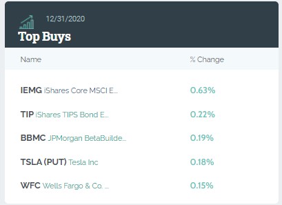 从持仓比例变化来看,前五大买入标的分别是:新兴市场coreETF-iShares(IEMG.US)、通胀债券指数ETF(TIP.US)、JPMorgan BetaBuilders US Mid Cap Equity ETF(BBMC.US)、特斯拉看跌期权(TSLA.US,PUT)、富国银行(WFC.US)。