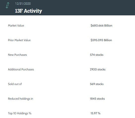 根据美国证券交易委员会(SEC)披露,摩根大通递交了截止至2020年12月31日的四季度(Q4)持仓报告(13F)。