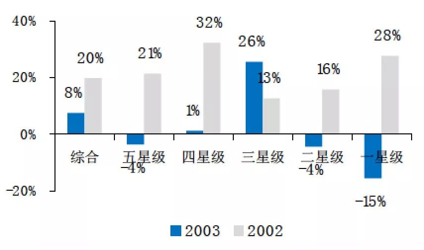 酒店住宿业当年受到的冲击非常明显。2003年,全国星级饭店出租率同比下降4%,收入增速仅为8%,相比2002年的增速下滑12%。低星级收入受到的冲击更明显,其中一星级饭店收入增速下滑高达43%,二星级饭店收入增速亦有20%的放缓。