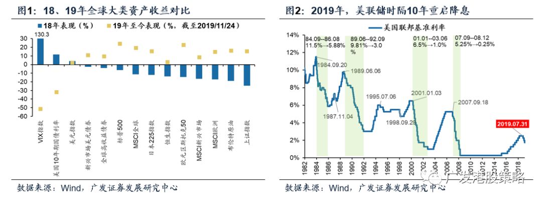 对于全球大类资产而言,2019年是“喜大于忧”的一年。美联储等多国央行重启降息,欧央行再次进入QE。在全球央行“竞赛式宽松”的背景下,利率和波动率下行驱动风险资产估值扩张,主要权益资产价格反弹。以标普500指数收益率为例,年初至今美股上涨的核心贡献来源于利率下行与风险偏好改善驱动的估值扩张,而其中利率下行的贡献最为显著。