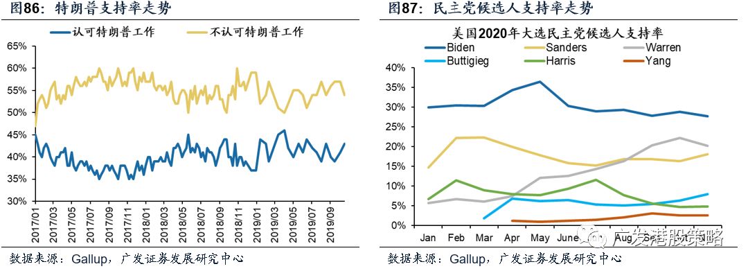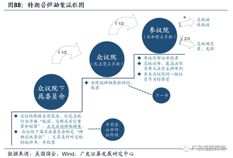 潜在威胁或来源于“总统弹劾案”,但特朗普被弹劾下台风险不大。今年9月,民主党针对特朗普与乌克兰总统的“电话门”事件,对特朗普开展弹劾调查;10月31日,众议院投票通过一项决议,为公开调查提供铺垫;目前弹劾已进入公开听证阶段,后续众议院或将进行全体投票。但鉴于共和党在参议院占据多数党席位,且目前证据仍不充足,特朗普面临被弹劾下台的风险不大。