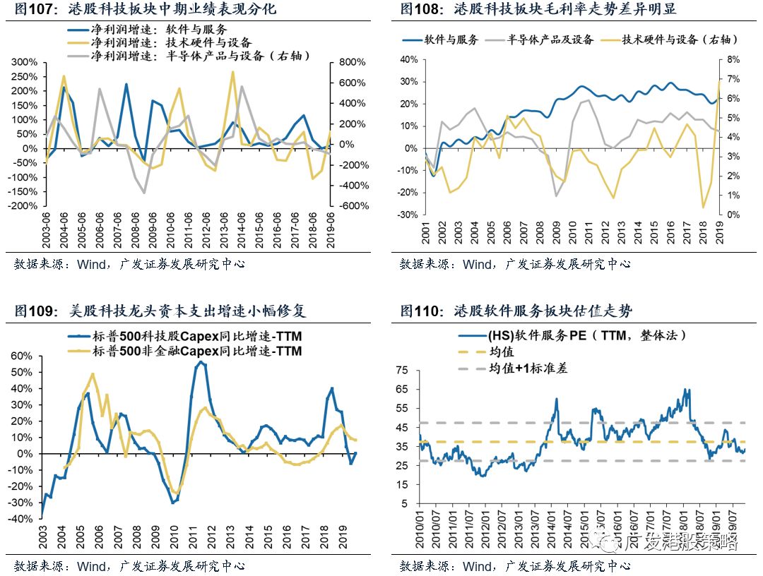 另外,对于港股传统互联网龙头,我们认为其2020年的表现将边际好转:1)由阿里巴巴(09988-SW)在港第二上市带动,且未来受益于更多互联网及软件服务优质标的在港交所上市,增加板块投资吸引力;2)板块最大权重公司腾讯控股2019年受政策因素及头条竞争影响业绩受到压制,根据广发海外互联网组预测,2020年腾讯外部影响减弱,同时新增长驱动(社交广告、金融科技等2B业务)日益显著,业绩同比增长将改善,加上估值回落,明年有望跑赢市场。