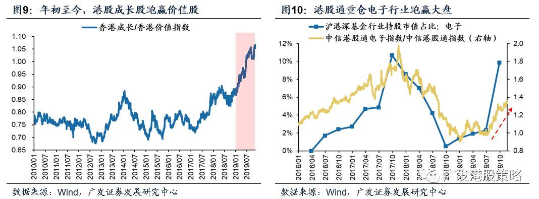 3)从9月份开始,外部风险边际好转,加上港股中报中资股业绩好于悲观预期,港股“估值弹簧”出现向上弹性,但估值修复过程仍受中美贸易谈判、香港本地事件反复等因素掣肘。