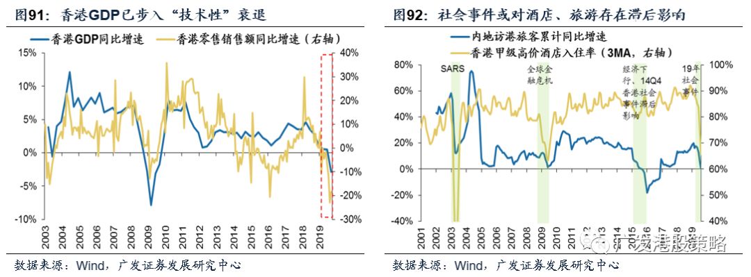 下半年以来香港本地社会事件持续发酵,已对香港经济造成显著冲击。三季度香港GDP同比下跌2.9%,经济已步入技术性衰退。从中观的数据来看,社会事件对香港地产、零售、酒店行业压制明显。并且,我们预计此类本地股的基本面下行仍未结束——参考2014-2015年的经验,社会事件对本地酒店入住、内地访港旅客增速存在“滞后性”的影响。