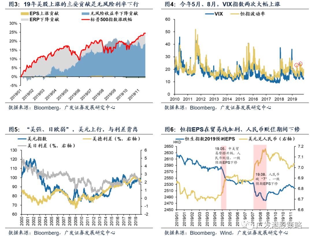 对于港股而言,联储降息扩表、欧央行开启QE的背景下全球利率中枢下移,2019年本应是一个“西水东流”驱动的估值扩张之年,但19Q2-Q3的“强美元、弱人民币”、高波动率、本地社会事件打破了海外资金流入的“正循环”,宽松流动性被外部“黑天鹅”严重干扰,使得港股动态估值反而出现收缩。
