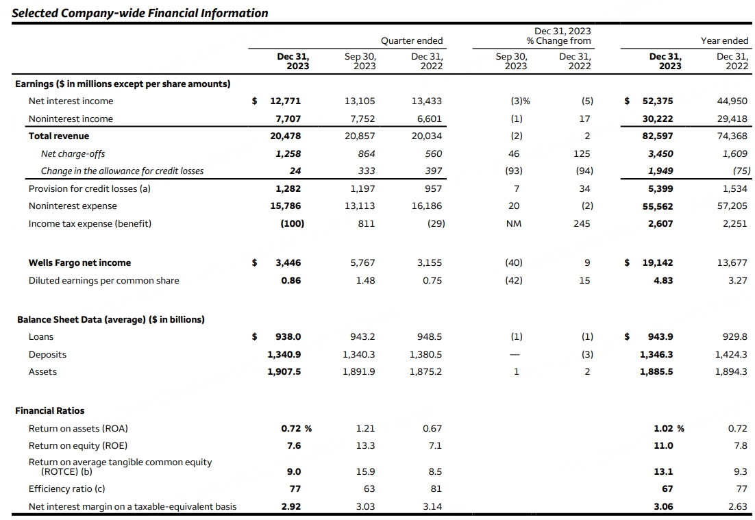 1月12日,富国银行发布2023年第四季度业绩。财报显示,第四季度营收204.78亿美元,市场预期203亿美元,去年同期196.6亿美元;净利润34.46亿美元,市场预期32亿美元,去年同期28.64亿美元;每股收益0.86美元,市场预期0.71美元,去年同期0.67美元。