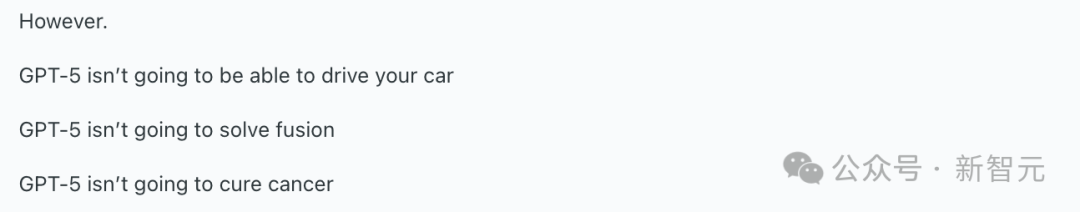 比如有人觉得,GPT-5无法驾驶你的汽车,GPT-5无法解决核聚变问题,GPT-5无法治愈癌症......