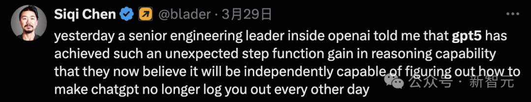 在3月29日,获得内部信息的Runway CEO兼AI投资人Siqi Chen就称,GPT-5已经在推理方面取得了意想不到的阶跃函数增益。