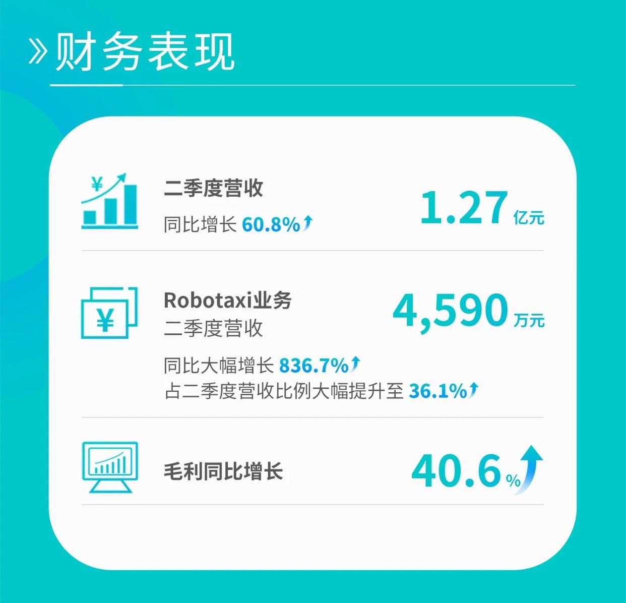 二季度,文远知行营收1.27亿元,同比增长60.8%。其中,Robotaxi业务占二季度营收比例36.1%,营收达4590万元,同比增长达836.7%,创下了公司成立以来单季度新纪录。同样增长的还有毛利率,同比增长40.6%。