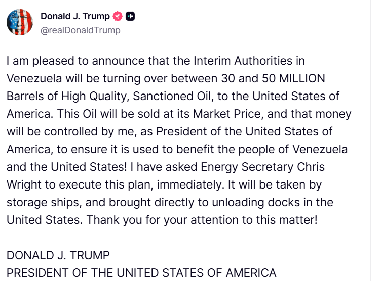 1月7日,美国总统特朗普宣布,委内瑞拉临时政府将向美国移交3000万至5000万桶石油。这些石油将按市场价格出售,而所得资金将由特朗普进行监管,以确保这些资金用于“造福委内瑞拉人民和美国人民”。