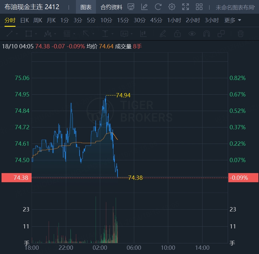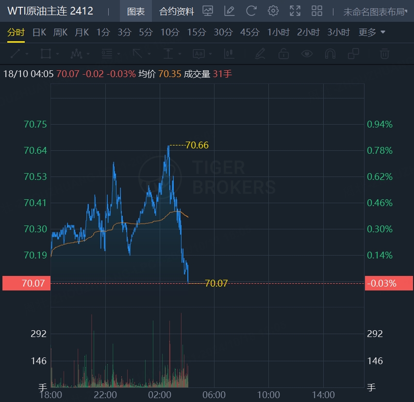 原油期货冲高回落,WTI原油报70.07美元/桶,跌0.03%;布油现报74.38美元/桶,跌0.09%。