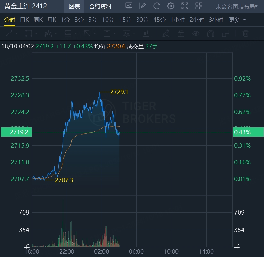 黄金期货震荡上扬,续创历史新高,现涨0.43%,报2719.2美元/盎司。