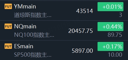 美股三大股指期货小幅上涨,截至发稿,道指期货涨0.01%,纳斯达克100指数期货涨0.44%,标普500指数期货涨0.17%。