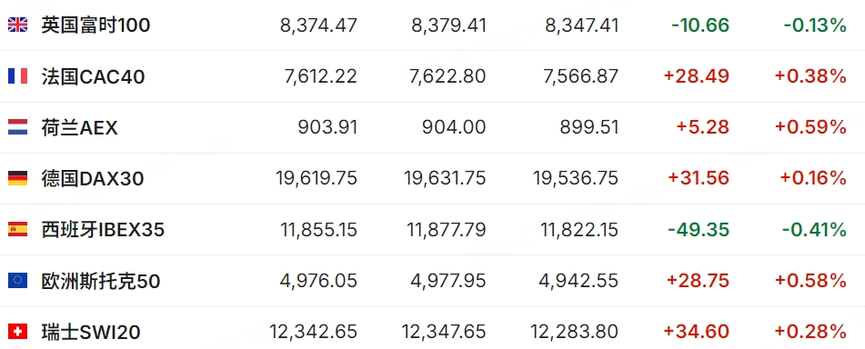 欧洲主要指数多数上涨,德国DAX30涨0.16%,英国富时100跌0.13%,法国CAC40涨0.38%。