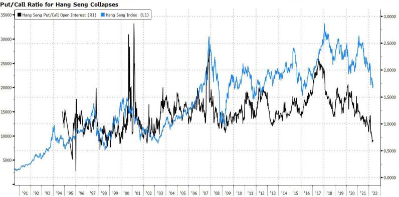 恒生指数put/call持仓比率已经降至20多年来最低水平,显示随着市场的持续暴跌,已经完全price in坏消息,在这个点位再做空已经没多大意义,从历史上看,这表明底部进一步夯实。