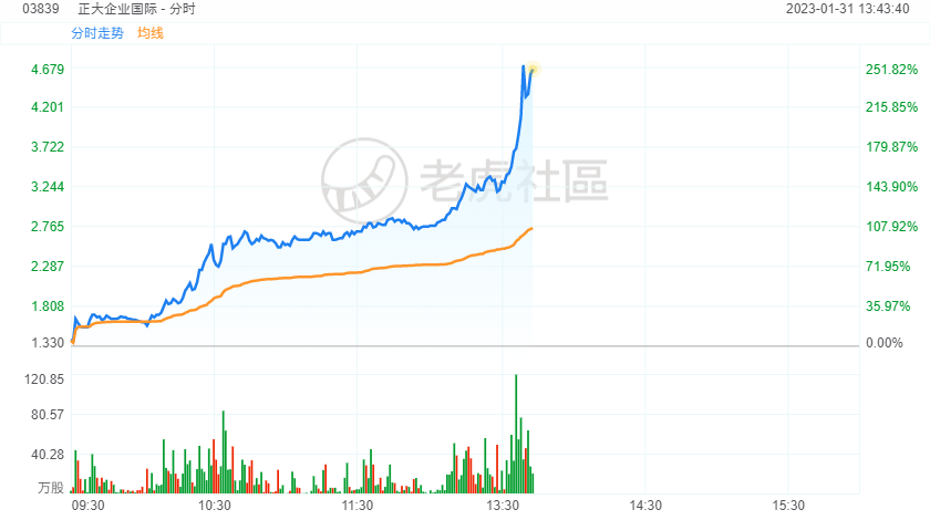 1月31日,泰国首富谢国民旗下的正大企业国际再度飙升超250%。目前,正大企业国际是正大集团在港的唯一上市平台。昨日该股大涨68.35%,盘中更一度涨超过75%。