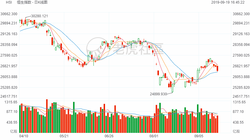 9月19日周四,恒指早盘高开66.61点或0.25%,但之后一路走低。截至收盘,恒生指数跌285.17点或1.07%,报26468.95点,全日成交额705.78亿。国企指数跌0.89%,报10385.35点,红筹指数跌1.04%,报4263.82点。