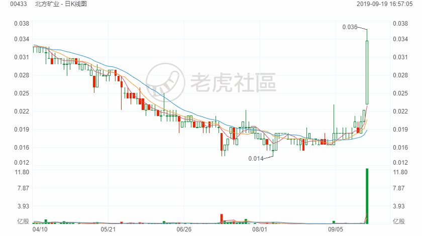 美9月18日,北方矿业与广州基金国际及执董儿子钱一栋订立谅解备忘录。广州基金国际拟认购认购股份合共约3.5亿港元;钱一栋拟认购认购股份合共5000万港元。受消息影响,股价大涨超60%。截至收盘,涨54.55%,报0.034港元,全天成交额3812.35万港元。