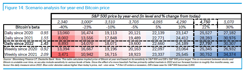长期来看,Laboure 认为,考虑到比特币与风险资产间的高度相关性,若标普500指数年底回升至4750点,以2022年来比特币与该指数日频率数据下1.45的beta值计算,比特币有回升至2.7万美元上方的可能。“但即便如此,仍不到去年11月峰值的一半”,Laboure 写道。