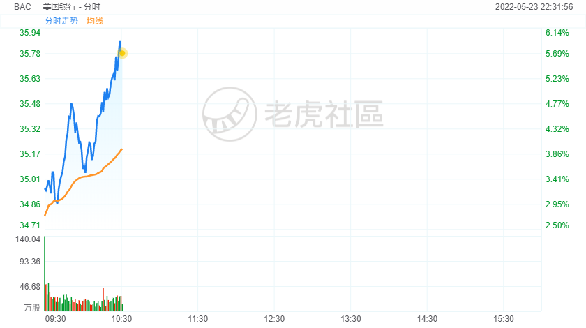 5月23日,美股银行股拉升,美国银行涨近6%,摩根大通、花旗涨超5%,富国银行涨超4%,高盛、摩根士丹利涨近3%。
