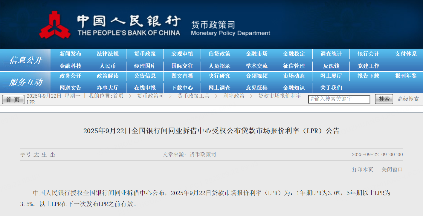9月22日,中国央行将一年期和五年期贷款市场报价利率(LPR)分别维持在3%和3.5%不变。