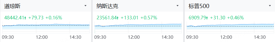 周二(12月23日),美股三大指数收涨。截至收盘,标普500指数涨0.46%,报6909.79点;道琼斯指数涨0.16%,报48442.41点;纳斯达克综合指数涨0.57%,报23561.84点。