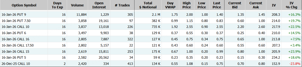 Sable Offshore隔夜飙涨36%,期权合约成交8.9万张,较90日均量放大2.3倍。2026年1月16日到期的9美元的行权看跌期权交易量特别高,共有11,884份合约交易。 $SOC 20260116 9.0 PUT$