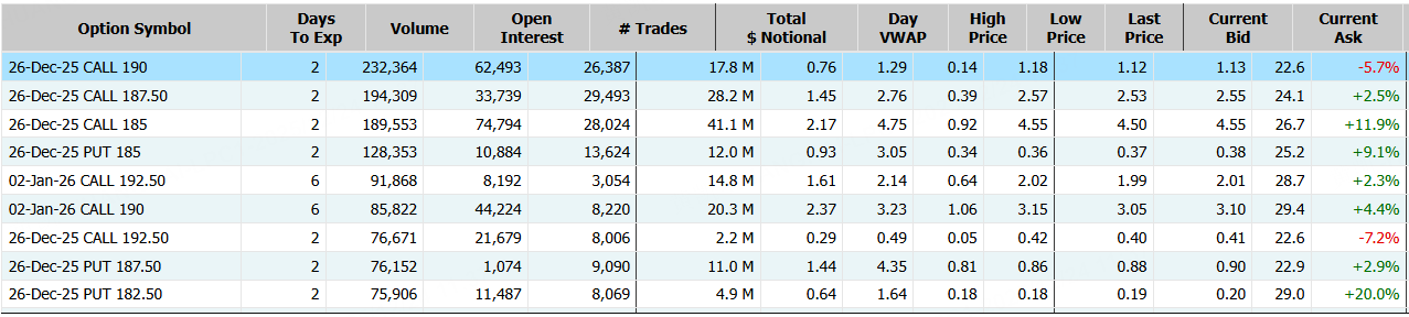 英伟达隔夜收涨超3%,期权合约成交292.80万张,12月26日到期的190美元的行权看涨期权交易量特别高,共有232,364份合约交易。 $NVDA 20251226 190.0 CALL$