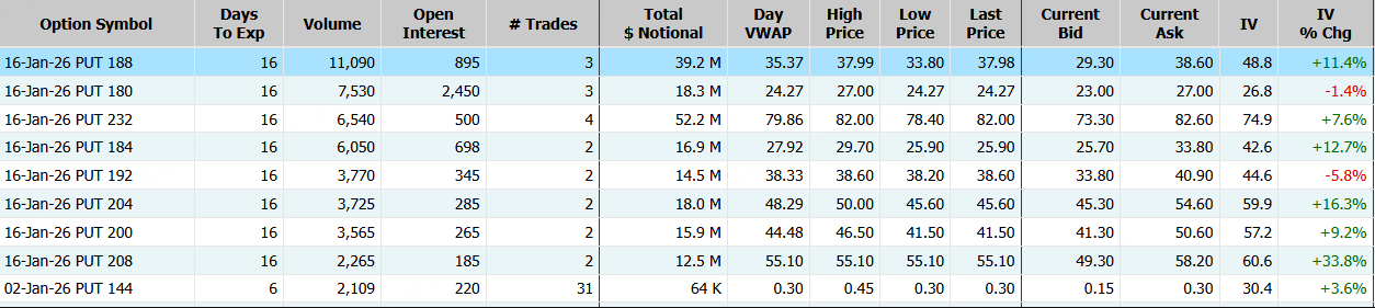 ServiceNow隔夜跌超1%,期权合约成交8.6万张,较90日均量放大6.3倍。2026年1月16日到期的188美元的行权看跌期权交易量特别高,共有11,090份合约交易。 $NOW 20260116 188.0 PUT$
