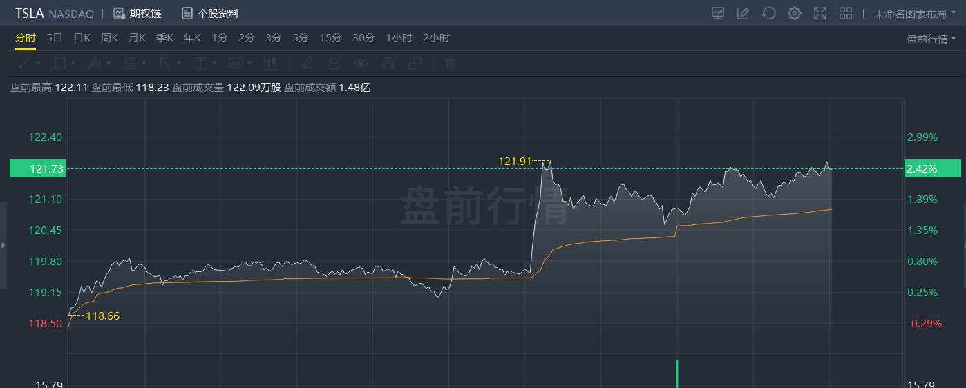 特斯拉盘前持续走高,截至发稿涨超2.4%。