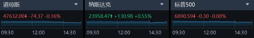 周三,美股三大指数涨跌不一,道指标普高位回落,纳指再创历史新高。截至收盘,道琼斯指数跌0.16%,报47632点;标普500指数跌0.3点,报6890.59点;盘中两只指数一度刷新高,但在美联储主席鲍威尔讲话后明显回落。