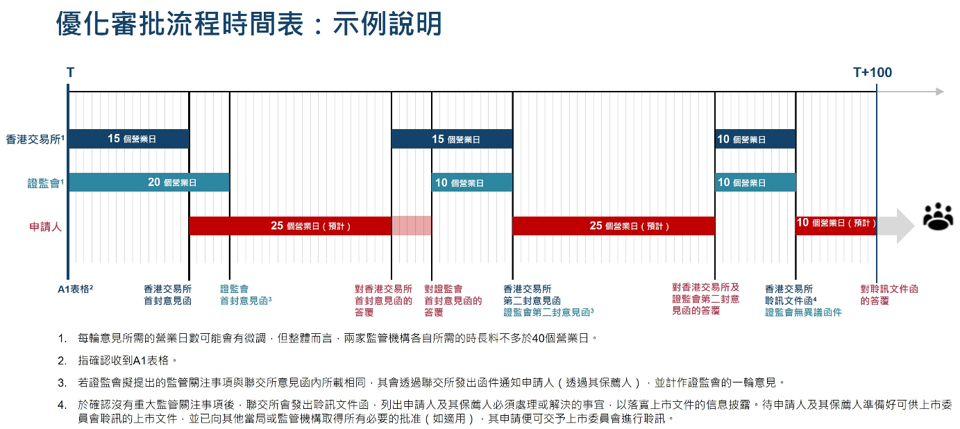 申请人及其保荐人预期可于总共约60个营业日内就监管机构提出的意见给予完美答复。待取得上市委员会及其他相关部门或监管机构批准后,申请程序预计可于六个月的申请有效期内完成。