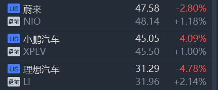中概股造车新势力美股盘前普涨,理想汽车涨超2%,小鹏汽车、蔚来汽车涨超1%。
