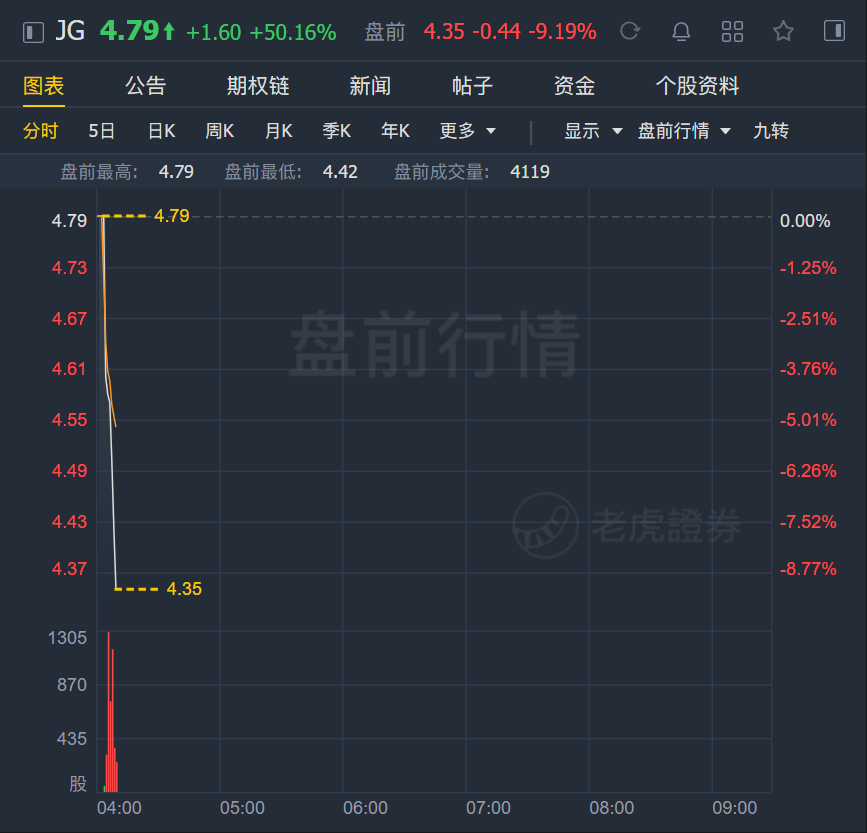 极光美股盘前跌超9%,隔夜收涨超50%。