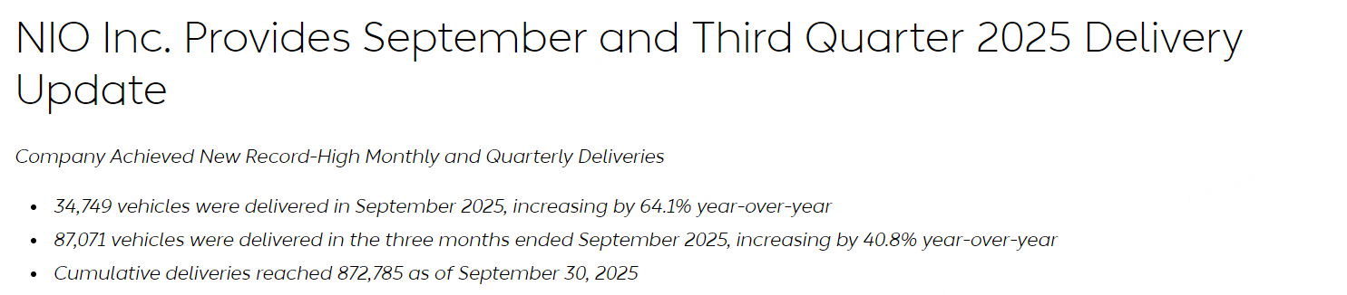 • 截至2025年9月30日,蔚来累计交付量达872,785辆