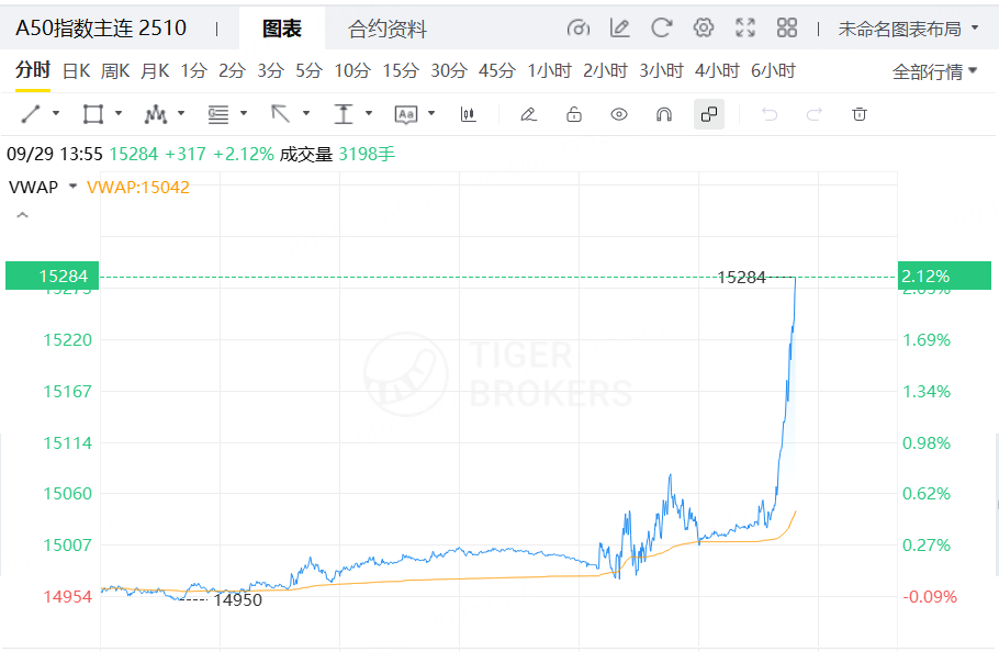 9月29日,富时中国A50指数期货涨幅扩大至2%。