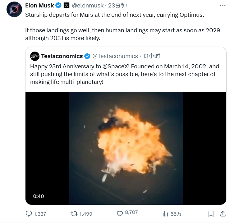3月15日,马斯克表示,星舰将于明年年底前前往火星,届时还将携带特斯拉人形机器人擎天柱(Optimus)。如果携带着擎天柱的星舰在火星上的着陆进展顺利,人类登陆火星最早可能在2029年开始,不过2031年的可能性更大。