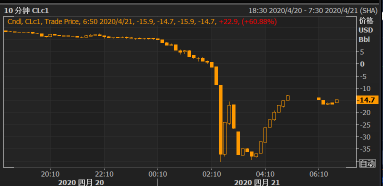 不过周二(4月21日)开盘后7分钟,WTI原油5月合约跳涨23.63美元/桶至-14美元/桶。