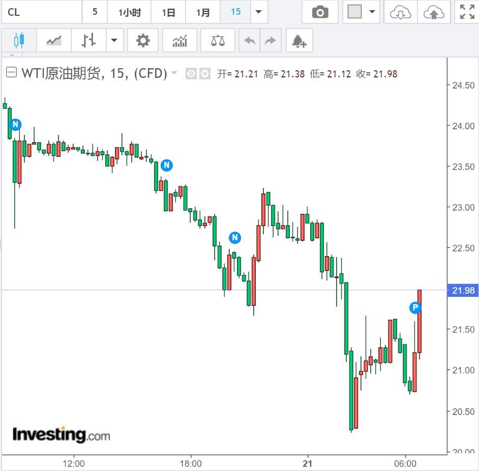 另据路透报价,截止06:35,WTI原油期货6月合约涨3.23%至21.07美元/桶。