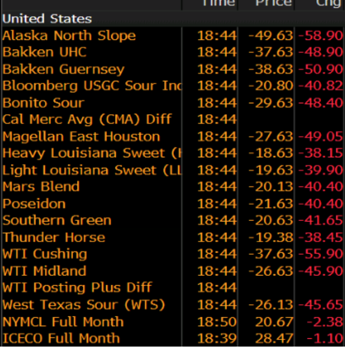 除了WTI原油期货以外,几乎所有的美国实物原油交割价格,不论地点和品种均进入负值区域。