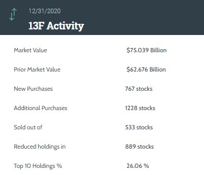 据统计,汇丰Q4持仓总市值为750.39亿美元,上季度为626.76亿美元,环比上升约19.7%。持仓组合中新增了767只标的,增持了1228只标的,减持了889只标的,清仓了533只标的。前十大持仓标的占总市值的26.06%。