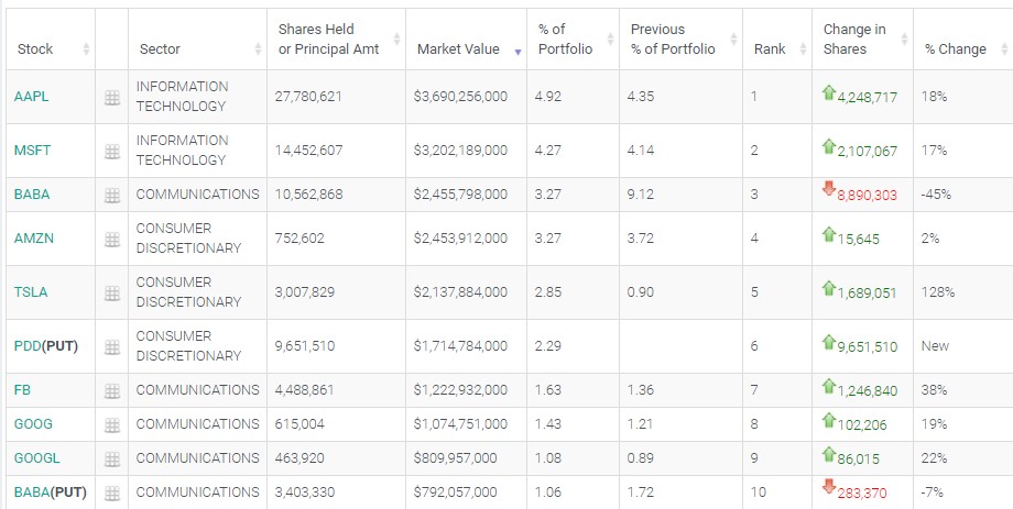 按汇丰Q4持仓市值排名,前5大重仓股分别为苹果(AAPL.US)、微软(MSFT.US)、阿里巴巴(BABA.US)、亚马逊(AMZN.US)、特斯拉(TSLA.US),分别占仓位比重的4.92%、4.27%、3.27%、3.27%,2.85%。重仓股中,汇丰大幅减仓阿里巴巴,减仓幅度高达45%;大幅加仓特斯拉,加仓幅度高达128%。