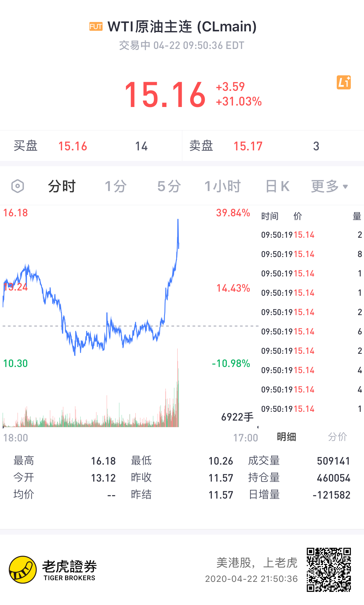 截止发稿,WTI原油6月合约涨31.03%,报15.16美元/桶。