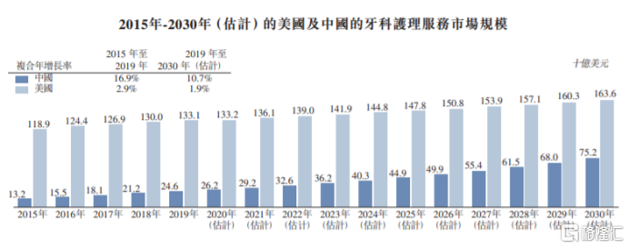 中国牙科护理行业市场规模将加速追赶美国。根据灼识数据显示,2019年美国牙科护理服务市场达到1331亿美元,同期中国市场规模246亿美元,仅为美国的18.5%。预计2030年美国和中国市场规模将分别达到1636亿美元和752亿美元,年复合增长率分别为1.9%和10.7%。
