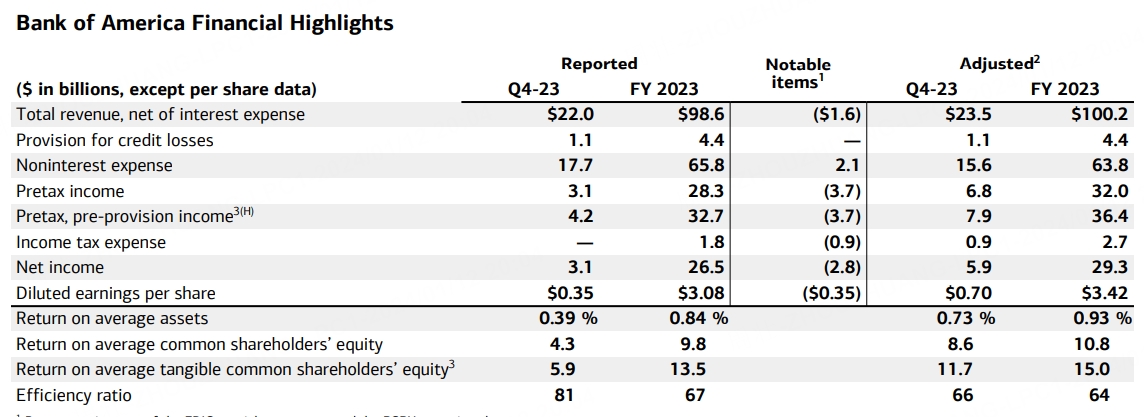 1月12日,美国银行发布2023年第四季度业绩。财报显示,第四季度营收219.59亿美元,市场预期237.4亿美元,去年同期245亿美元;净利润28.38亿美元,市场预期45.25亿美元,去年同期69.04亿美元;每股收益0.35美元,市场预期0.46美元,去年同期0.85美元。